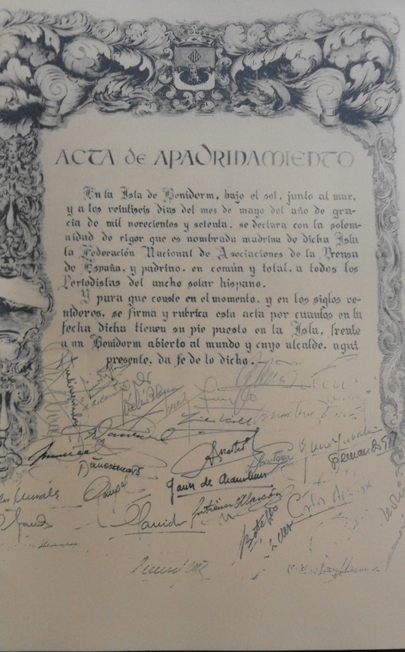 El alcalde del Ayuntamiento de Benidorm era Jaime Barceló; fue él quien propuso el siguiente Acta de apadrinamiento, donde se puede leer: “En la Isla de Benidorm, bajo el sol, junto al mar, y a los veintiséis días del mes de mayo del año de gracia de mil novecientos y setenta, se declara con la solemnidad de rigor que es nombrada madrina de dicha Isla la Federación Nacional de Asociaciones de la Prensa de España, y padrino, en común y total, a todos los Periodistas del ancho solar hispano. Y para que conste en el momento, y en los siglos venideros, se firma y rubrica esta acta por cuantos en la fecha dicha tienen su pie puesto en la Isla, frente a un Benidorm abierto al mundo y cuyo alcalde, aquí presente, da fe de lo dicho”.