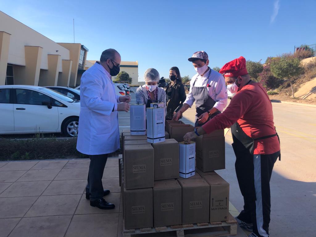 Joaquín Selma, fundador y responsable de la marca SELMA Olive Oil, ha hecho entrega hoy a Alicante Gastronómica Solidaria de 300 litros de aceite de oliva virgen extra (AOVE) para su utilización en la elaboración de los menús destinados a personas en riesgo de exclusión social que lleva a cabo la asociación.