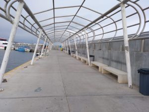 La estructura tiene unas dimensiones de 55 metros de longitud y 5 metros de ancho. El estado en que se encontraba el elemento estructural presentaba una imagen deficiente. Y, si bien la estructura metálica no tenía problemas estructurales que afectaran a su estabilidad, debido a su ubicación (zona portuaria con trasiego de mercancías y personas), uso, ambiente marino e inclemencias meteorológicas, numerosos pilares presentaban golpes y arañazos en la pintura, y los tubulares de cubierta de acero inoxidable presentaban una pátina superficial de óxido y salitre.