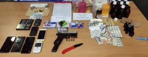 En el registro, los agentes incautaron 40 gramos de hachís, 30 gramos de marihuana, 450 pastillas de ansiolíticos, dos balanzas de precisión, una pistola de aire comprimido y varios cartuchos de pistola, así como varias recetas médicas falsificadas y un sello médico con número de colegiado utilizado para la manipulación y falsificación de dichas recetas.