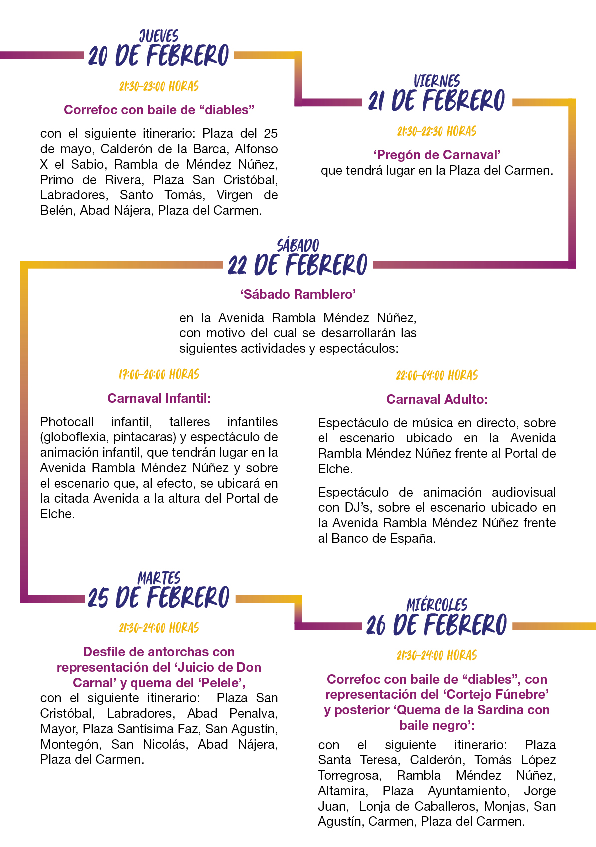 El correfoc del jueves 20 de febrero discurrirá desde las 21.30 a las 23 horas. Partirá de la Plaza del 25 de Mayo para continuar por Calderón de la Barca, Alfonso El Sabio, Rambla, Primo de Rivera, Plaza de San Cristóbal, Virgen de Belén, Abad Nájera y Plaza del Carmen. Al día siguiente, tendrá lugar el Pregón de Carnaval, a partir de las 21.30 horas, en la Plaza del Carmen.