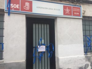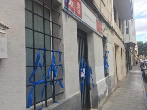 El Secretario de Organización del Partido Socialista de Elda, Jesús Sellés, ha denunciado que la sede del partido eldense ha aparecido esta mañana con lazos azules en su fachada. Según ha indicado Sellés, “parece ser que se ha puesto de moda intentar amedrentar y callar al PSOE de Elda con ataques”, en referencia a los insultos y pintadas recibidas el pasado mes de agosto con motivos franquistas y racistas.