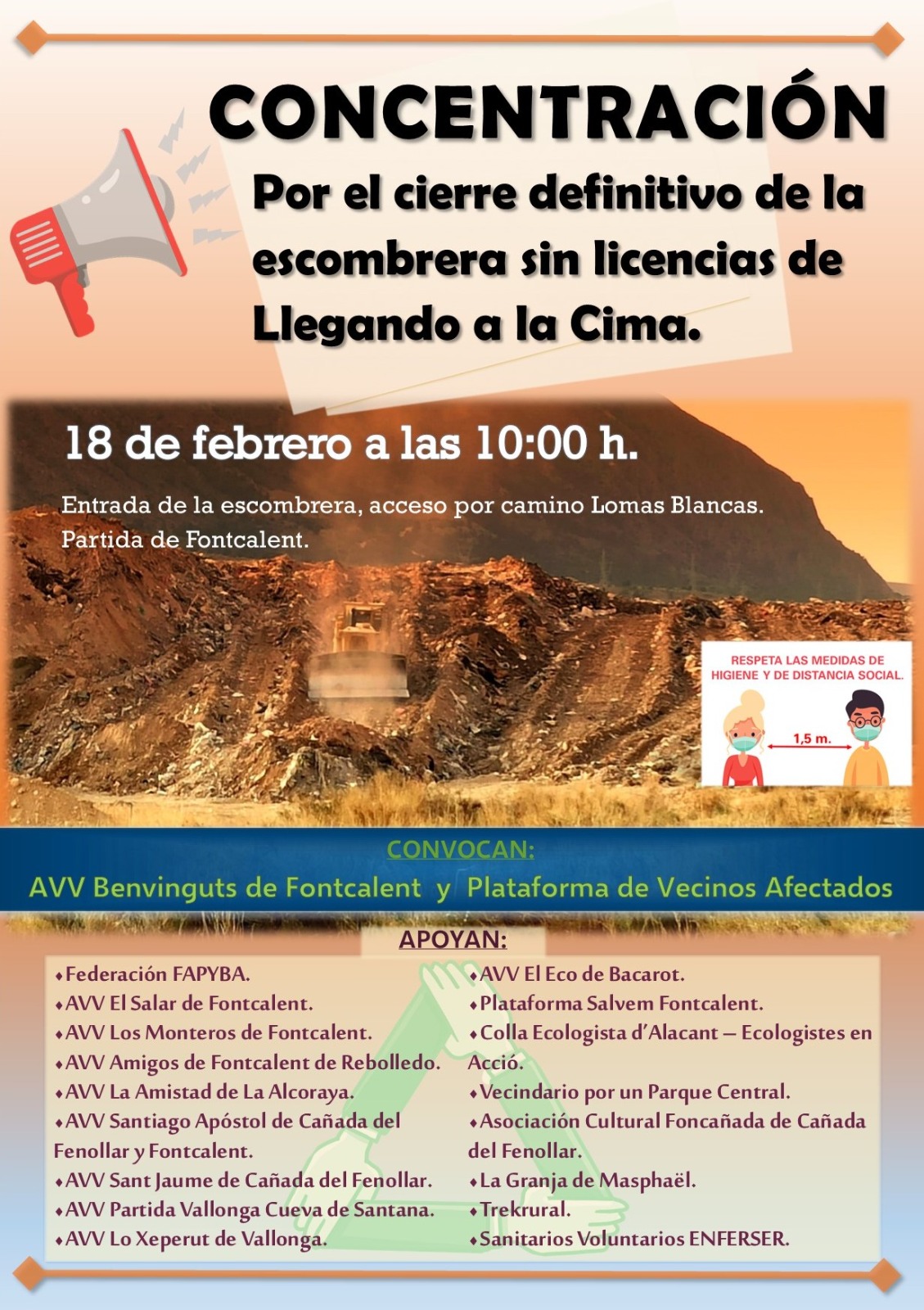 Un grupo de residentes de la partida de Foncalent de Alicante y 17 colectivos culturales y vecinales de la ciudad han cortado esta mañana el camino de acceso al vertedero de escombros que les hace la vida imposible. Reclaman al Consell y al Ayuntamiento de Alicante que se cierren las instalaciones de esta escombrera “por las contínuas infracciones que comete la empresa”. Denuncian que se están manipulando materiales no autorizados y que la empresa permite que se expandan residuos por los alrededores, lo que hace inviable una normal convivencia con los vecinos de la zona.
