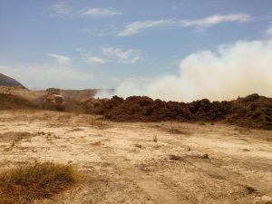 La concejalía de Seguridad del Ayuntamiento de Alicante informa que los bomberos del Servicio de Prevención, Extinción de Incendios y Salvamento del Ayuntamiento de Alicante (SPEIS) trabajan desde hace siete horas en la extinción de un virulento y complicado incendio originado en una empresa de restos de poda de árboles originado en la partida de La Alcoraya. El SPEIS ha recibido el aviso pasadas las 11.30 horas de esta mañana, y en su extinción trabaja un operativo con una veintena de bomberos que se han desplazado con cinco dotaciones completas, y realizan relevos para intervenir en su total control y extinción junto con retroexcavadoras que remueven los restos de la poda de palmeras de un complicado incendio.