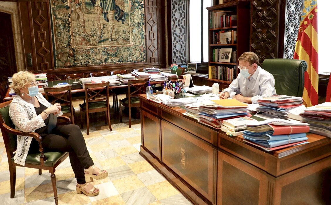 El president de la Generalitat, Ximo Puig, ha mantenido una reunión de trabajo con la consellera de Sanidad Universal y Salud Pública, Ana Barceló, para analizar la situación sanitaria actual de la Comunitat Valenciana y las nuevas medidas dirigidas al control de los rebrotes de COVID-19. La reunión, que se ha celebrado en el Palau de la Generalitat, coincide con el primer día de aplicación de las limitaciones establecidas con el acuerdo de todas las comunidades autónomas en el seno del Consejo Interterritorial del Sistema Nacional de Salud celebrado el pasado viernes.